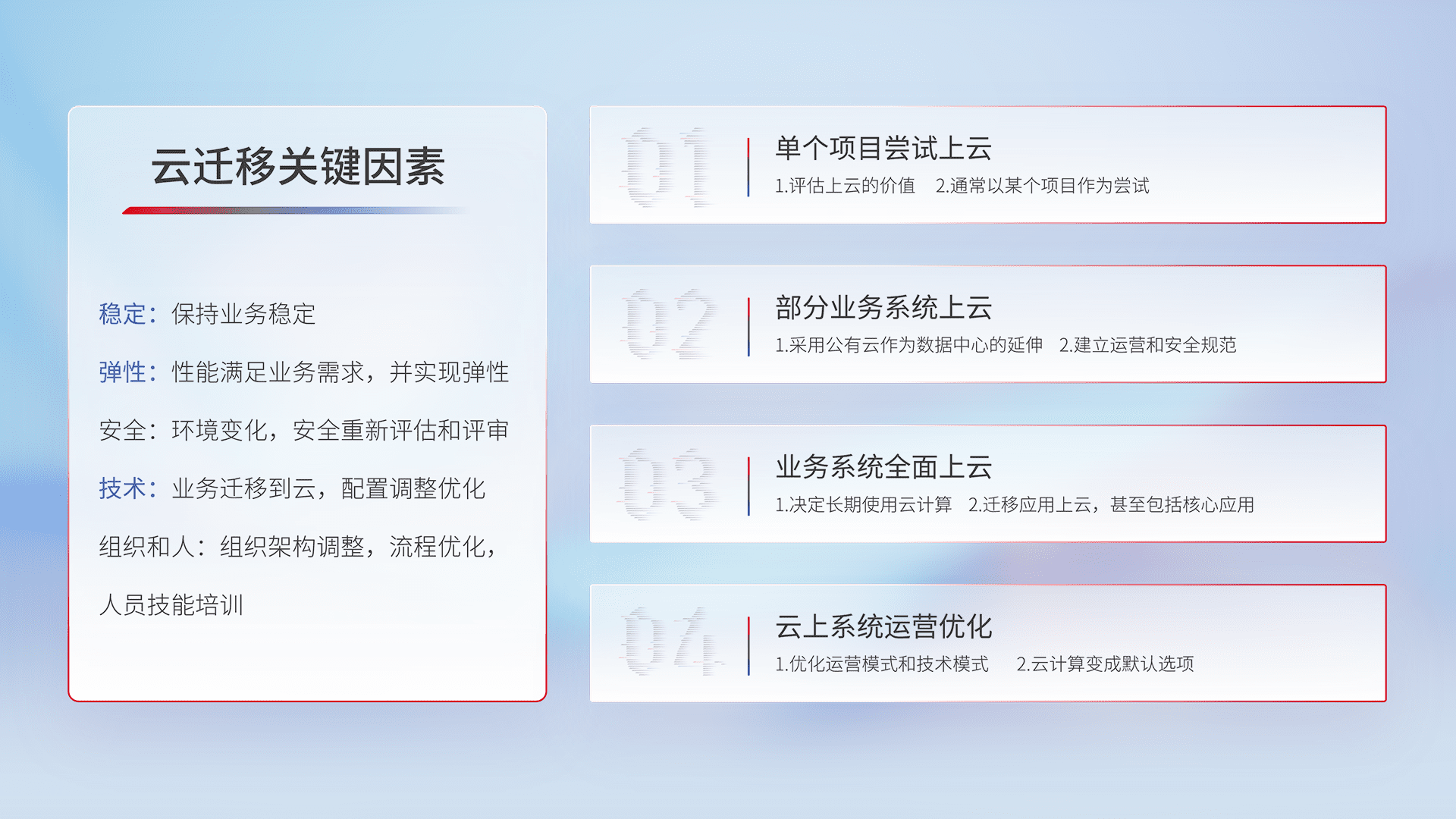 结合实际业务,,,从规划设计、、、、云平台选型、、、、云原生改造、、、数据迁移、、集成交付,,,迁移全过程为客户识别最佳上云路径,,,做好风险识别管理,,,设计网络架构、、身份权限、、、、安全审计合规、、、、操作审计、、日志审计、、监控告警策略、、多站点容灾设计等,,,,对云上基础设施进行整体规划,,,提升IT治理水平,,,以满足弹性、、、、高可用、、高性能的需求。。。。