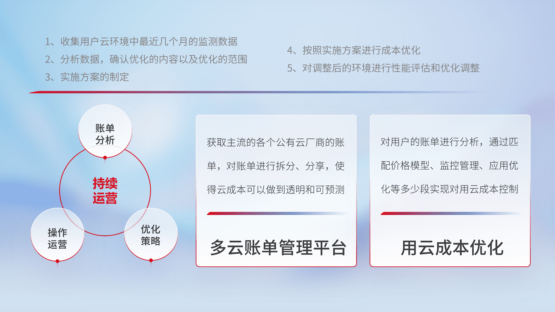 通过多云纳管,,以统一的资源数据模型把客户的云资源进行抽象和封装,,,进而实现对多云资源的统一操作,,保障云资源管理的可靠性、、、稳定性与可用性。。。量身定制化运维内容,,,,配置、、开发运维、、补丁管理、、、备份、、、监控、、认证和访问管理、、、审计和日常巡检等,,,保障在用云过程中的可靠度,,,,稳定度以及高可用率。。。。
